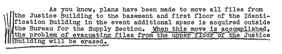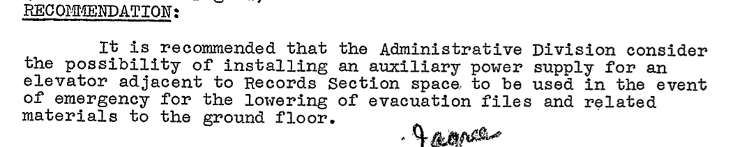 There were a few problems with this plan, including that once an emergency was underway there might not be time to evacuate the files that way and that it would expose the files and the lift operator that would be outside the building. The Bureau decided to ignore these problems and asked for additional funds to cover the $4,000 plus the installation and wiring cost. When the Executives Conference was informed that the money would have to come out of their budget, they immediately recommended against it and settled on the far better idea – preemptively moving the documents to the first floor and the basement.
