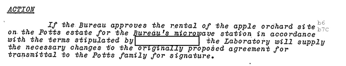 Forced to look elsewhere, the Bureau decided to consider using the radio equipment located eight miles away. To bridge the gap, they would simply run telephone wires to the radio equipment. The same memos that proposed this noted that the reason they wanted to use radio equipment was that the telephone wires would be unreliable and easy to disrupt. Eventually, the Bureau was able to find a solution – they offered the Potts family more money for the lease.