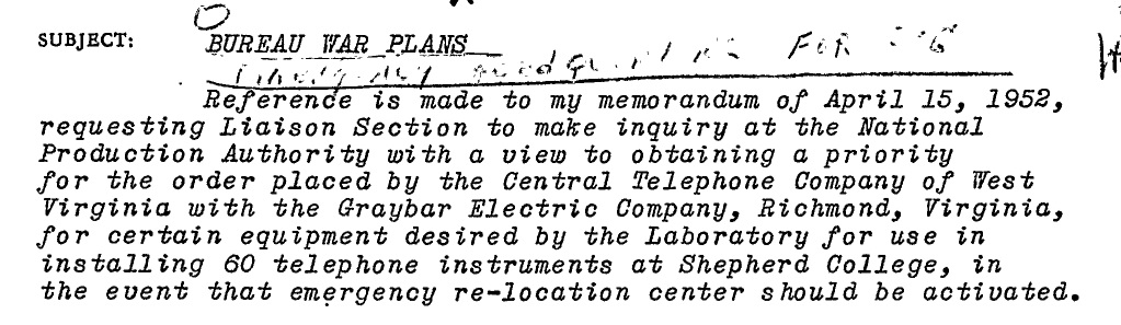 Once the FBI had selected the site of its emergency headquarters, the Shepherd College (now Shepherd University) campus of Shepherdstown, WV, they quickly got underway preparing everything they would need to occupy the campus and make it a functional emergency headquarters.