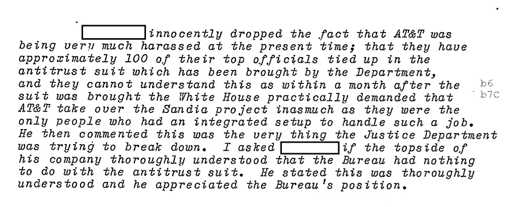 With the location sorted out, the Bureau was left with only one problem – installing and maintaining the equipment with a cover that would explain the presence of the equipment. The FBI approached AT&T, but found them problematic for a number of reasons. First, the area wasn’t part of AT&T’s turf, making it difficult for them to explain their presence there as normal. Second, they were a competitor of Motorola, who was supplying the equipment and might pull out if AT&T became involved. Third, they were being sued by the Justice Department – a fact which they “innocently” mentioned to their Bureau contact.