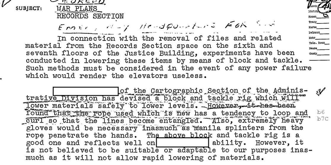 These files were located several floors up, and couldn’t be quickly moved down to the ground floor. Assuming there would be a power loss and that the elevators would be useless, the Bureau looked into using a block and tackle rig to manually lower the documents and equipment, but decided this would be impractical since it could only perform twelve loads an hour.