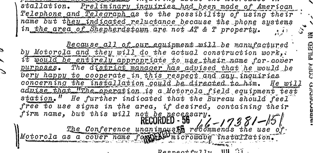 The company was happy to oblige and was willing to have the Bureau’s communications site described as a Motorola test site. The company was made responsible for the installation of the equipment, albeit only after a great deal of debate over how many people would be given clearances. That issue seemed to take Motorola by surprise, as they were denied access to one of the locations they needed to survey by military personnel.