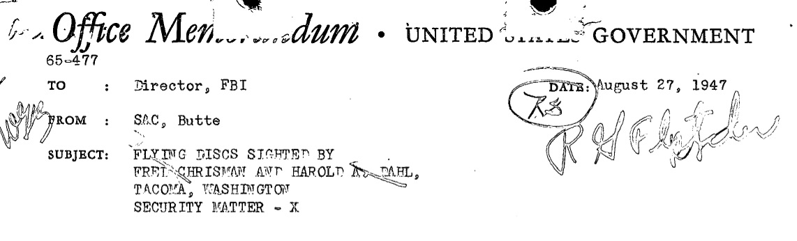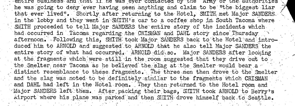 A few days later, another memo is issued for the Director of the FBI, J. Edgar Hoover, labeled “SM – X,” an abbreviation for “Security Matter – X,” complicates the story slightly. According to this memo, the people aboard the crashed plane had met with Dahl and Crisman to discuss the “flying discs” story and had taken a sample of the rocks.
