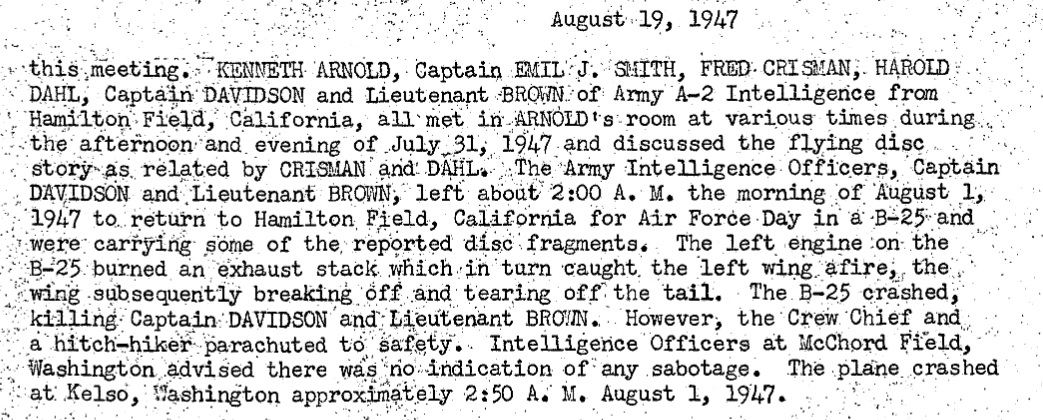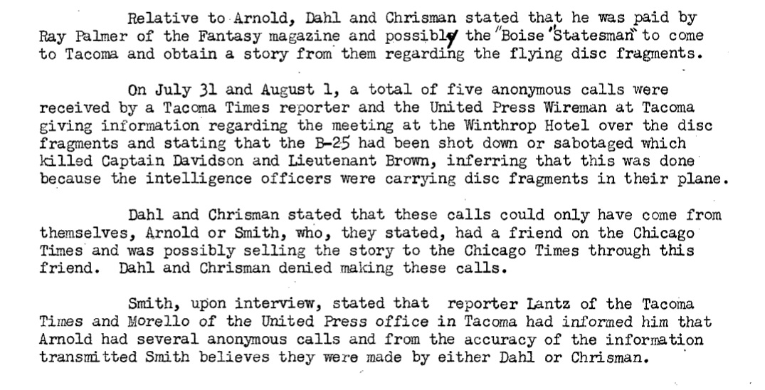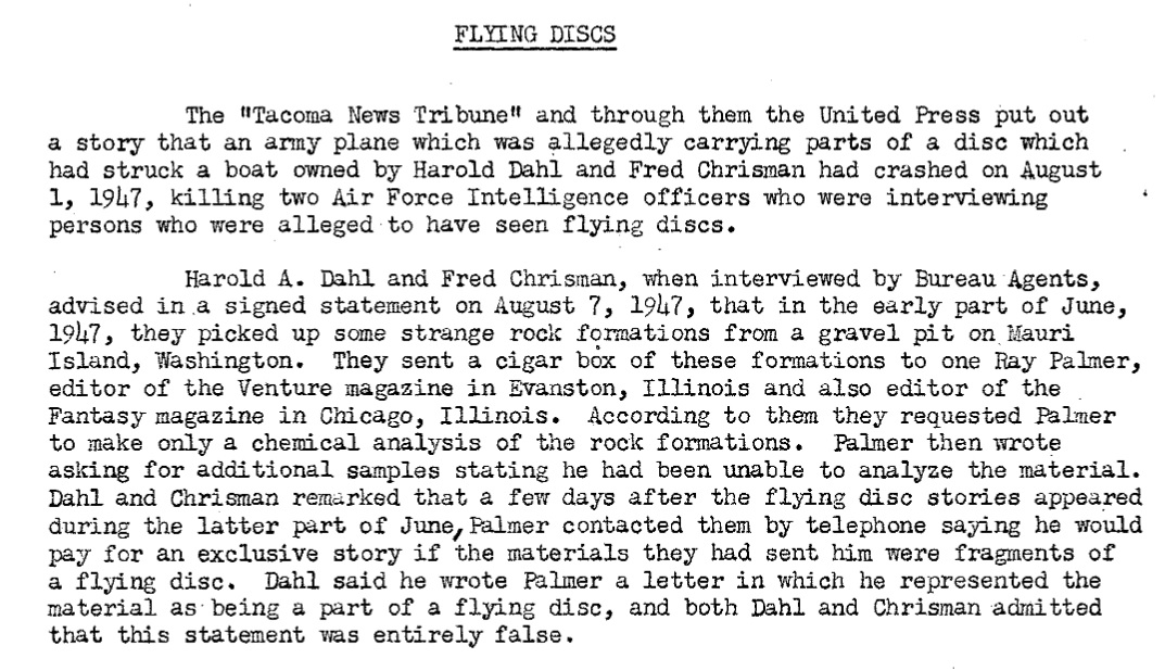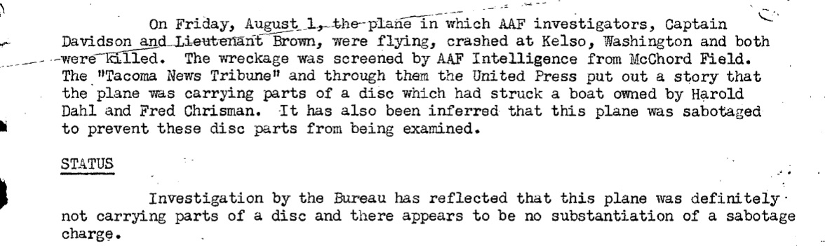 The story then gained additional coverage when a government plane crashed, a plane which was said to be carrying fragments from the Maury Island Incident. The FBI file on Crisman indicates that the Bureau quickly determined the matter was a hoax, though the file is careful to note that Dahl “did not admit that his story was a hoax but only stated that if questioned by the authorities he was going to say it was a hoax because he did not want any further trouble over the matter.”