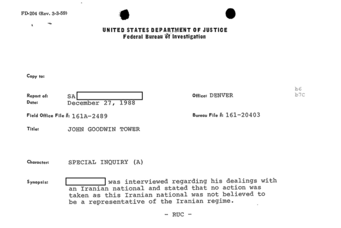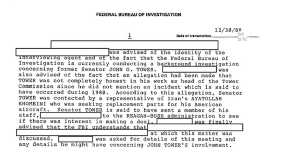 An FBI memo from 1988 reveals that they were investigating allegations that Senator Tower had been approached by a representative of the Khomeini regime in 1980 about supplying Iran with replacement parts for planes, planes which would be used in Iran’s war with Iraq.