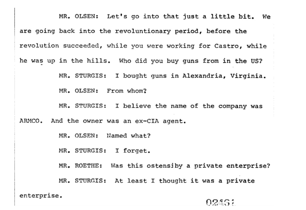 What’s undisputed, however, is the company’s longstanding association with the Agency. When the United States still supported Fidel Castro, it was through Cummings and Interarmco that Frank Sturgis acquired large numbers of weapons. According to Sturgis’ testimony before the Rockefeller Commission, he thought it was a “private enterprise” (words frequently repeated in the Iran-Contra proceedings to describe similar weapons transfers) but later learned the owner was a CIA agent.