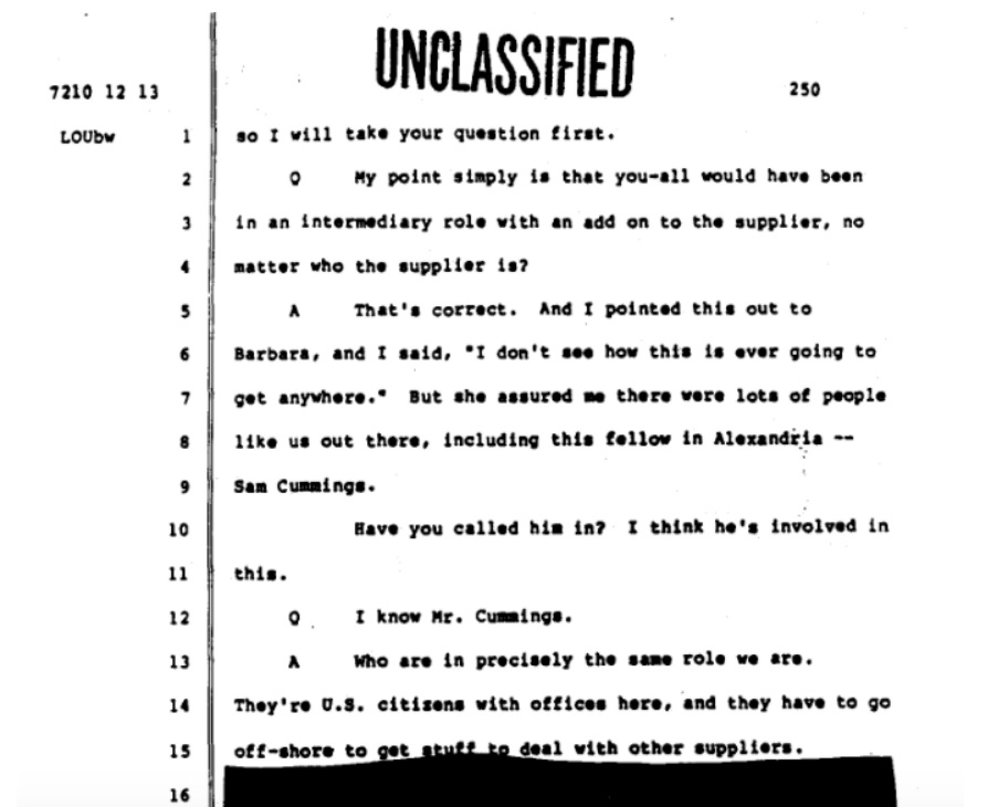 This wouldn’t be the only time that Cummings would “get away” with something. General Secord let slip a hint of Cummings’ involvement in Iran-Contra when, during the Iran-Contra hearings, he thought a reference to Colonel Dan Cummings relating to arms transfers referred instead to Sam Cummings. More significantly, Lt. General Robert Schweitzer, who had held senior positions on the NSC and in the Pentagon, named Cummings as having been involved in the transfer of arms during the same hearings. The full context of this, however, remains redacted.