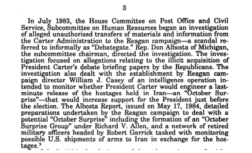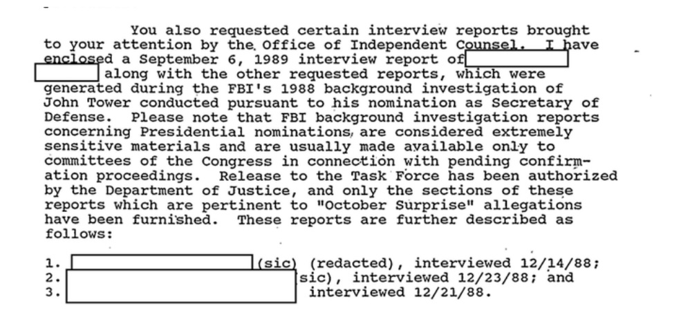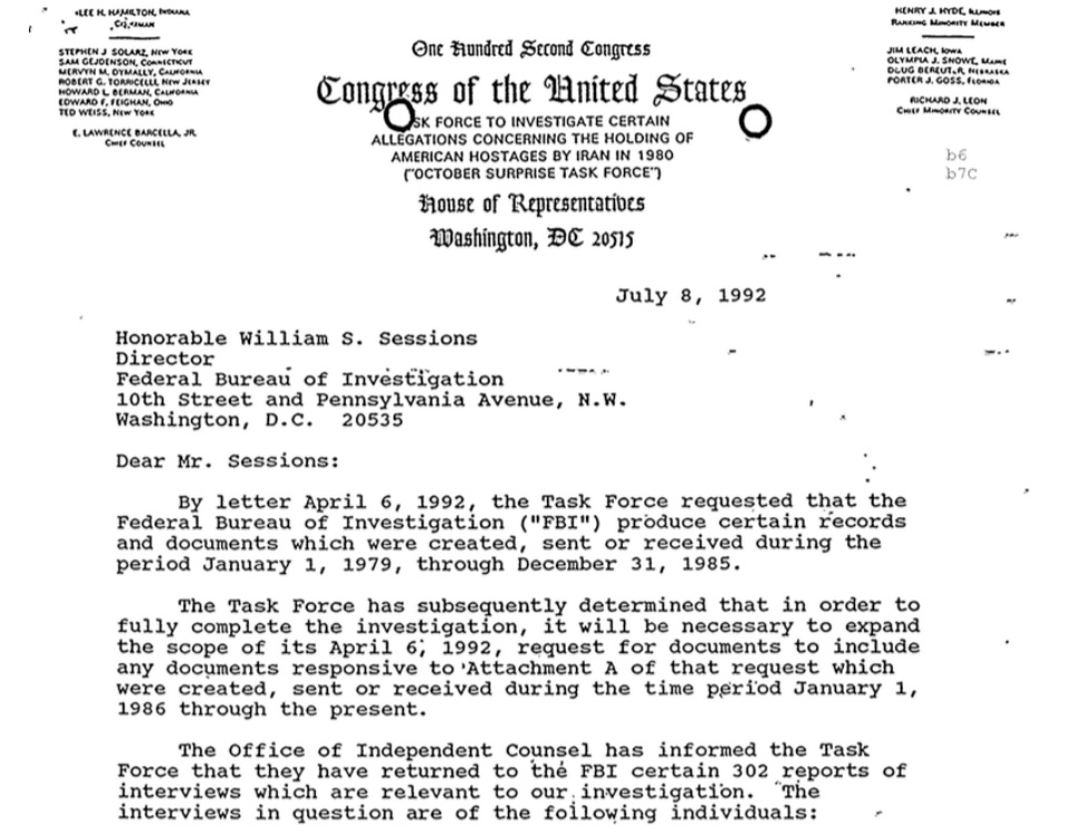 These allegations were not lost on the House of Representative’s October Surprise Task Force, which was then investigating the matter. The Task Force wrote to FBI Director Sessions and asked for access to certain files as part of their investigation.