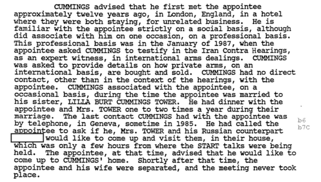 The FBI weren’t the only ones to omit references to Cummings – Tower completely failed to mention the man in the Tower Commission’s report. He was not, however, ignorant of the man’s work or its possible connections to Iran-Contra. According to the FBI’s interview of Cummings, the one professional contact that he shared with his brother-in-law was in January 1987 when Tower asked Cummings to testify in the Iran-Contra Hearings.