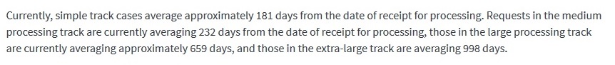 Even with this new definition, the FBI says that its average processing time for “simple” cases of 50 pages or less is 181 days – or slightly more than thirteen times the statutory limit. For complex cases, it’s 659 days – nearly fifty times what’s allowed by law.