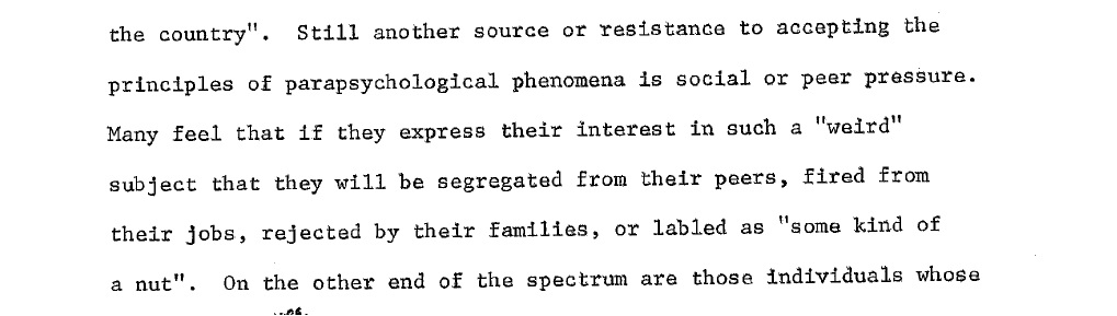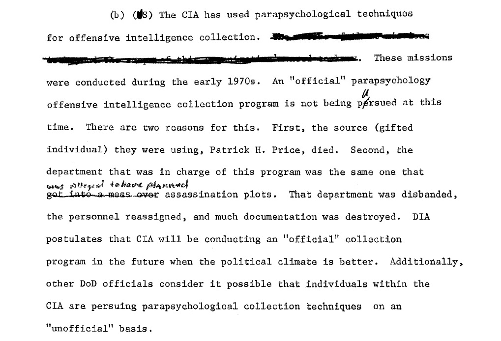 The claim that parapsychological/psychic techniques had been successfully used by CIA for offensive intelligence collection was repeated further down in the document, with an additional surprising claim. Not only had the programs been successful, but they had been officially disbanded after the Agency’s primary “gifted individual” died and the department in charge of the program had been disbanded in the wake of alleged assassination plots.