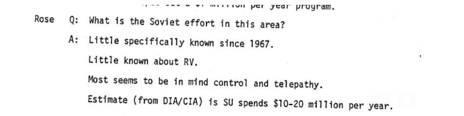 The subject of mind control did come up once during the briefing, in an answer to Congressman Rose. According to the briefing, most of the Soviet Union’s research (allegedly much better funded than the CIA/DIA/NSA/etc. research) was into telepathy and mind control – a recurring theme in briefings and documents on the psychic programs and the “psychic gap.”