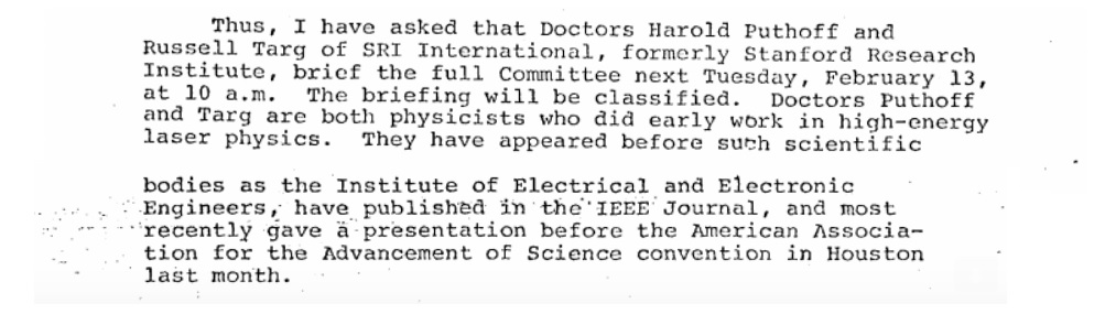 The letter goes on to say that the Committee hadn’t made “any determination to endorse the experimentation as valid or invalid, [but] it does find that continued activity in this field may offer promise in applications to intelligence problems.” Therefore, Congressman Rose was scheduling a briefing from Doctors Puthoff and Targ, who were involved in the project.