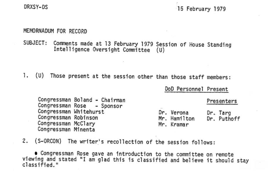 Warning about people’s sensitivity to the strangeness of parapsychology, and that the “uniformed” (likely a typo for “uninformed”) “would label such research more mind control experimentation,” Congressman Rose argued that this should all be kept confidential. According to a memo summarizing the later briefing, Congressman Rose again argued that the information should all stay classified.