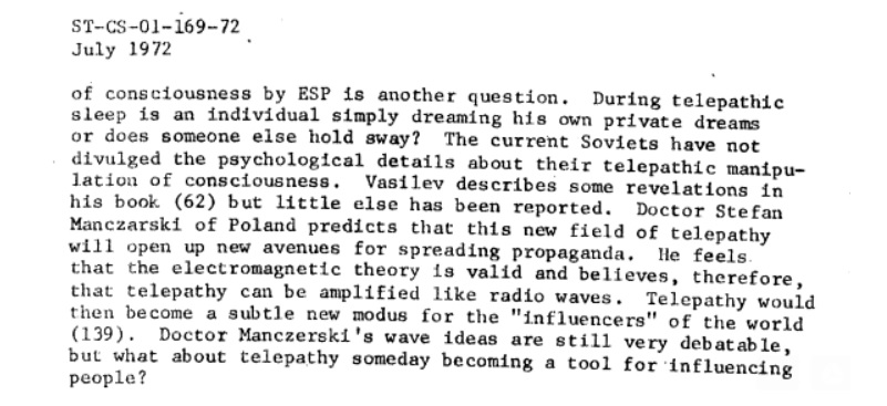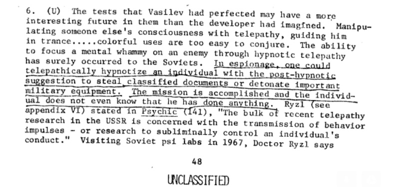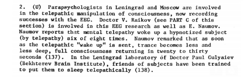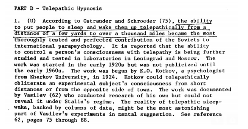An unclassified excerpt from the DIA parapsychological monograph on “Soviet Offensive Behavior” from 1972 outlines some of the Agency’s fears over reports of Soviet psychic abilities – specifically, “Telepathic Hypnosis.” The section claims that Soviets had managed to telepathically put people to sleep and wake them up from over a thousand miles away, with Kotkov, a star Soveit psychologist, able to “telepathically obliterate an experimental subject’s consciousness.”