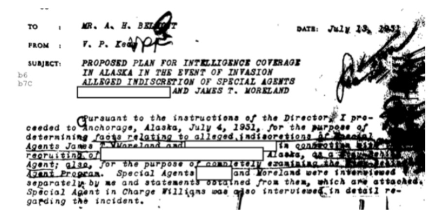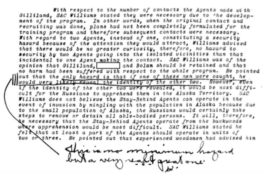 During the Cold War, the FBI created a plan to develop a network of Stay-Behind Agents in Alaska, who would become active in the event of a Russian invasion, become the backbone for domestic operations. Buried in the Bureau’s file is a memo documenting how the plan was endangered in 1951 by loose lips and poor operational security