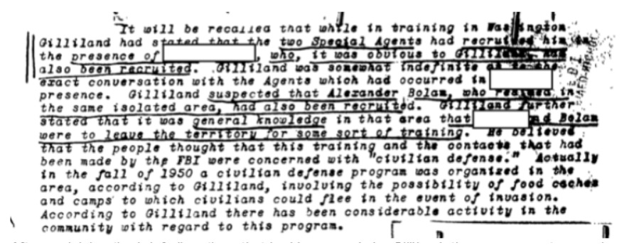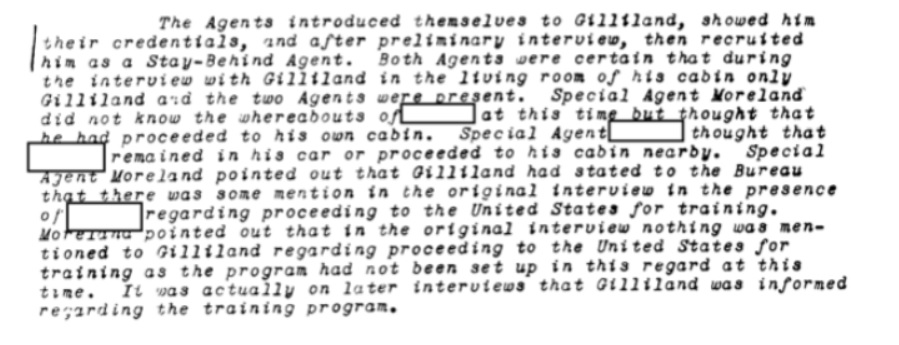 According to the memo, one of the Stay-Behind Agents who had been recruited by FBI Special Agent James Moreland, and a second individual whose name is redacted in the files, had been less than discreet about the arrangement. The Stay-Behind Agent, Gilliland, asserted that he had been recruited in the presence of another person who had been recruited into the program. Gilliland also suspected he knew the identity of another individual, and that people in general thought this was related to “a civilian defense program” initiated the previous year. This program would have involved food caches and helping people escape dangerous areas in the event of an invasion or other armed conflict.