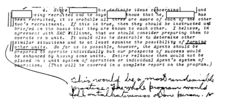 According to Williams, the program hadn’t been harmed and “the only hazard is that if one of these men were caught, he would very likely reveal the identity of the other two.” At the bottom of the page, FBI Director Hoover, who had ordered the highest security precautions for the program, remarked that “this is no minimum hazard but a very real and great one.” Indeed, this was the very reason that such compartmentalization existed in the first place.