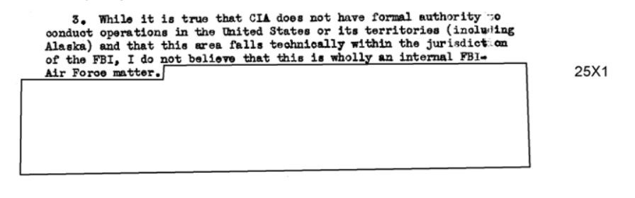 The memo also recognized “that CIA does not have formal authority to conduct operations in the United States or its territories (including Alaska).” Nevertheless, Lt. Colonel Marchant was of the opinion that it was not “wholly an internal FBI-Air Force matter.” The rest of the paragraph remains completely redacted.
