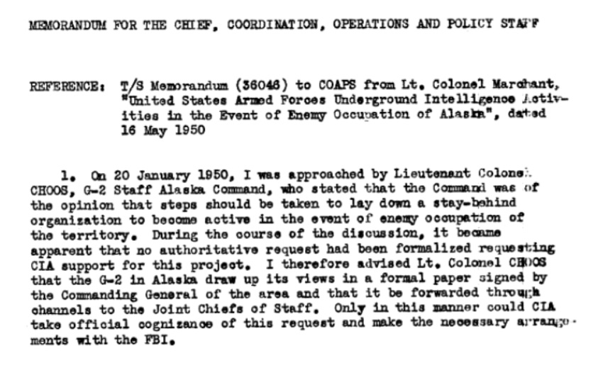 While the FBI’s Stay-Behind network in Alaska has been previously explored – including how it was partially driven to spite the CIA – the Agency’s role in the Cold War contingency has largely been kept secret. Previously classified records reveal that the military specifically sought to get the CIA involved in the earliest months of the program.
