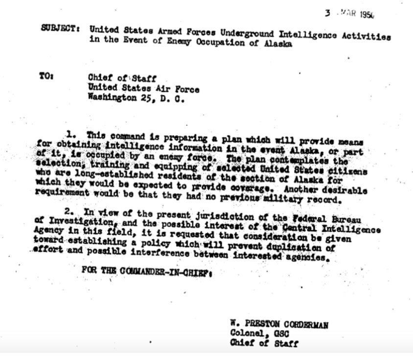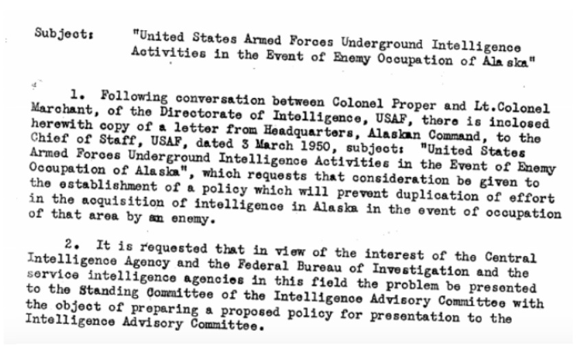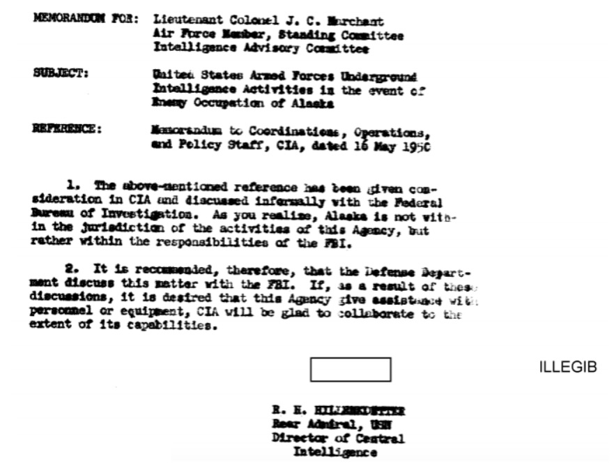 While the Bureau had been discussing programs to create “sleeper agents” in Alaska since as early as January 1950, it seems that CIA may not have been consulted until March. A memo with the subject “United States Armed Forces Underground Intelligence Activities in the event of Enemy Occupation of Alaska” from the Air Force’s Chief of Staff solicited the opinions of both the CIA and FBI Directors. The memo sought to establish a policy for the program in order to avoid duplication of effort or interference between the various agencies.