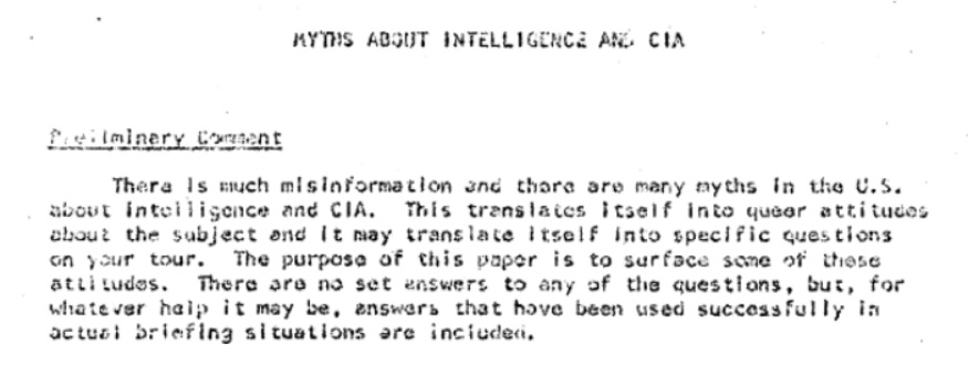 Included in the CIA’s declassified database is an October 1968 list of recommended responses to questions and “myths” regarding the Agency, which had all “been used successfully.” Many of the answers were dismissive, with recommended responses including changing the subject, questioning if an Agency failure was really a failure at all, and attempting to debunk accusations by calling them hearsay.