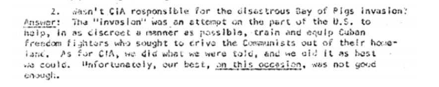 As for the Bay of Pigs failure, CIA’s response was that they did the best they could with the orders they were given. No mention is given to the communications breakdown, the failure to build a proper deception about the landing site, nor the fact that they couldn’t keep the time and location of the invasion a secret from either the New York Times or the Soviet Union. To their credit, CIA did concede that their best simply wasn’t good enough.