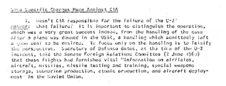 When presented with questions about specific instances of CIA failures, like the 1960 U-2 crash, the Agency’s recommended response was “What failure?” The Agency argued that the operation, which ended with the U-2’s crash, “was a very great success indeed” – it was only after the crash that things “left a great deal to be desired.”