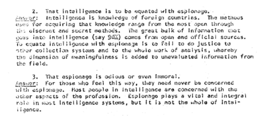 When asked about espionage is potentially “odious or even immoral,” the Agency recommended a response that included telling people not to worry about it and that intelligence work included 90% open sources, with relatively little coming from espionage. Aside from telling people who felt this way that “they need never be concerned with espionage,” the Agency did nothing to respond to the actual question of morality.