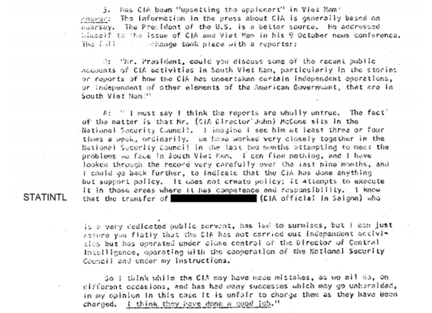 In response to accusations that CIA was upsetting the applecart in Vietnam, the Agency described such accusations as hearsay, quoting President Kennedy’s exchange with a reporter at a news conference. This tactic of referring to the denials of others is one which the Agency would frequently return to over the coming decades, as it let them maintain deniability and engage in lies of omission. Interestingly, the Agency redacted some of these comments, despite having been on the record with a journalist, because the individual being discussed had been a CIA official.