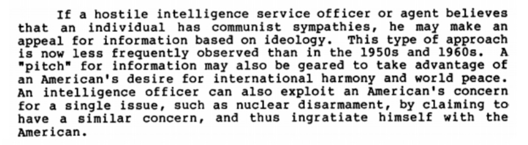 Ideological beliefs were also particularly exploited, though the focus had changed over the years. In the ’50s and ’60s, ideological approaches largely focused on those with “communist sympathies.” A more modern approach would be based on someone’s other views, such as a “desire for international harmony and world peace” or nuclear disarmament. Other ideological beliefs, such as a deep seated opposition to CIA or views on NATO, could similarly be used.