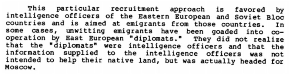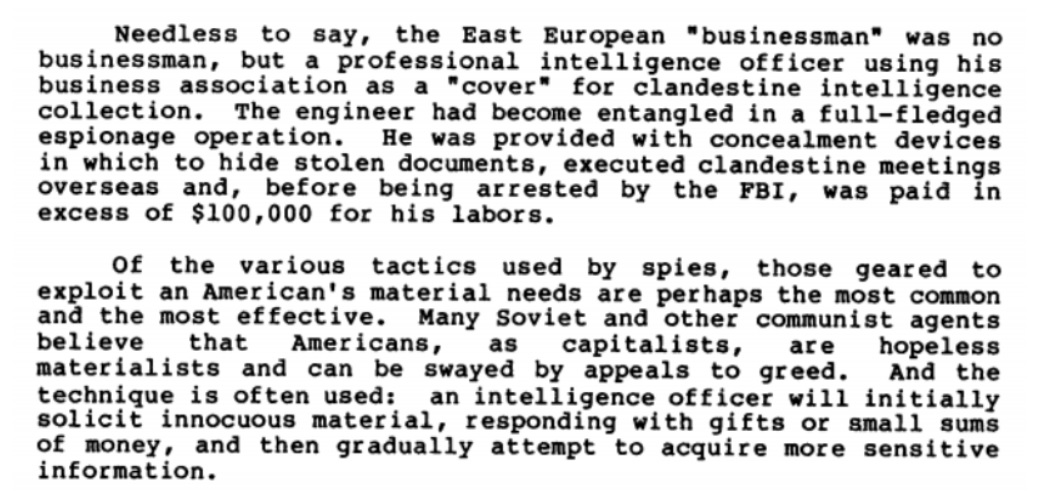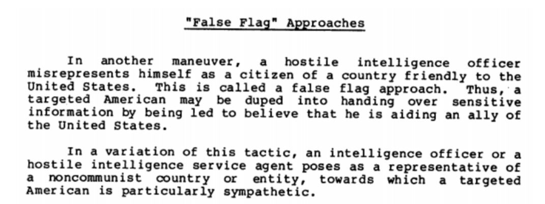 The pamphlet also lists several motives and techniques Russian and other Soviet operatives would use in their attempts to recruit someone: greed, blackmail, national pride, exploitation of emotions, “false flags”, ideology, naivete, and revenge. Each of these motives was illustrated with at least one example. Greed, for instance, was perhaps the most common and the most effective approach, as well as being the easiest to mask due to its veneer of legitimacy. In these scenarios, a “businessman” would turn out to be “a professional intelligence officer using their business association as a “cover” for clandestine intelligence collection.”