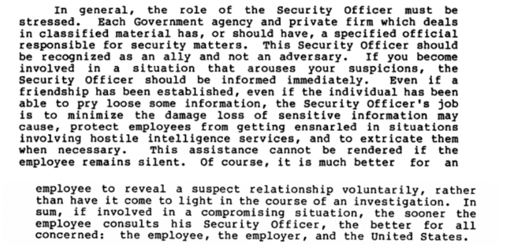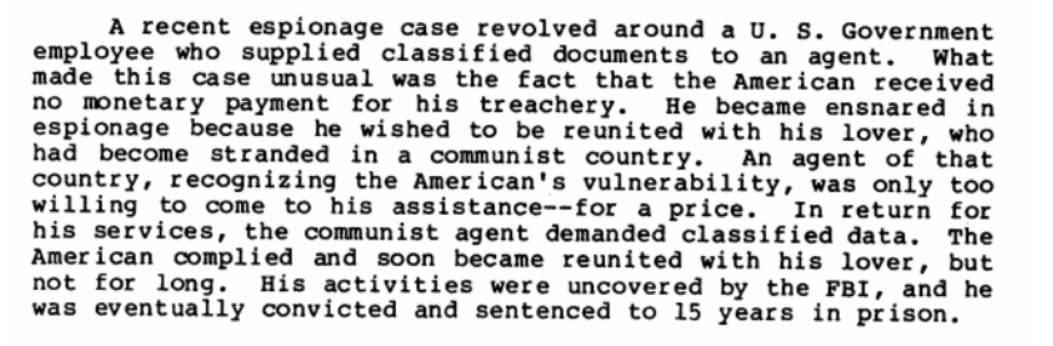 The second example, blackmail, often involved compromising Americans overseas “through sex and other ploys,” often recording the Americans or otherwise finding a way to exploit the encounter. Since this type of blackmail works much more effectively when the subject remains a secret, victims were encouraged to report it as soon as they became aware of what was going on. According to anecdotes, the half-joking KGB response was similar with agents, asking for a copy of the tape to show their wife.