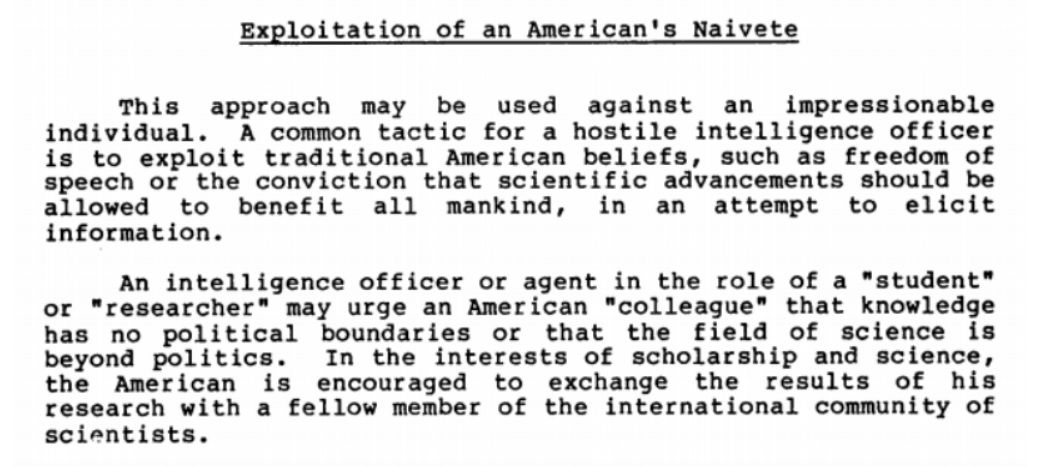 According to the pamphlet, foreign intelligence service would also exploit an American’s naivete. Using this approach, a foreign intelligence officer would rely on an American simply not seeing anything wrong with what they were doing. This might be based on principles of business, freedom of speech, the sharing of scientific advancements, or even negotiations based in politics and economics.
