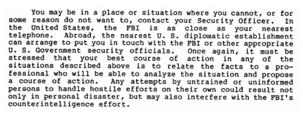 The solution to all of this, however, remained simple – avoid these meetings to begin with, and if they occur report them immediately to a security officer or to the FBI. The worst thing that someone could do would be to try to handle it on their own. The Bureau warned that “any attempts by untrained or uninformed persons to handle hostile efforts on their own could result not only in personal disaster, but may also interfere with the FBI’s counterintelligence effort.” Nor was there any need for someone to go it alone – for anyone in the United States, “the FBI is as close as your nearest telephone.”