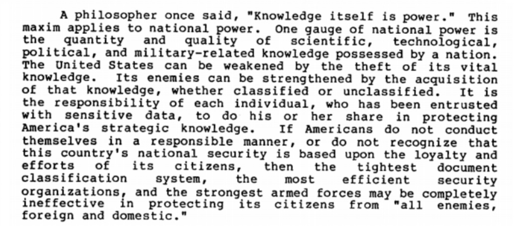 To stress the point further, the pamphlet warned quite clearly that a citizen’s failure to act responsibly in regards to such foreign contacts could render other security efforts moot.