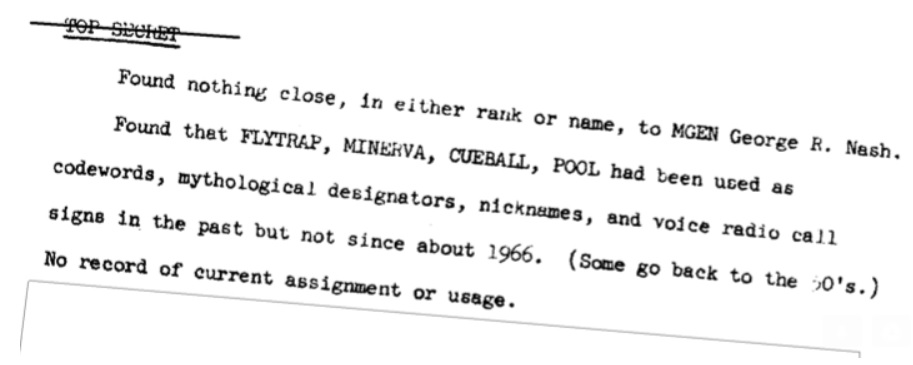 The second chapter of the NSA’s history begins with a note that a subject (seemingly Price) made a second psychic visit to an underground installation. From this psychic visit, he named several military officers who were apparently present. One of these individuals, with the US Air Force, was personally known to the author of the NSA documents. The other name was unknown, and the codenames provided seemed to have been largely unused in 1973, and apparently hadn’t been used since about 1966.