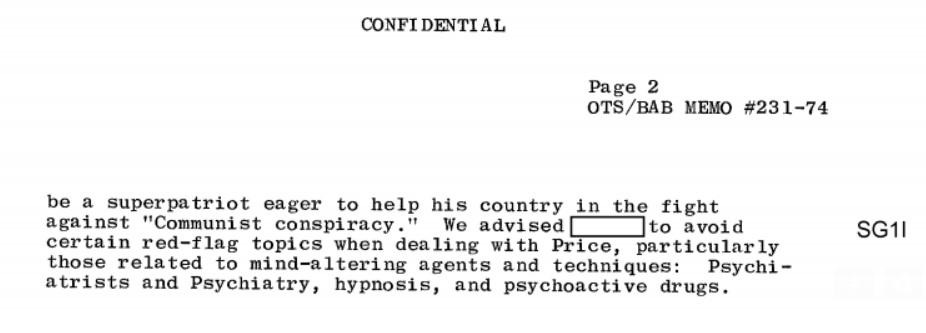The memo noted there was some curiosity about Price himself – he had previously helped police with his apparent psychic abilities, and he seemed to be a “superpatriot” eager to join the fight against “Communist conspiracy.” However, it would be important to avoid mentioning “red-flag topics” relating to “mind-altering agents and techniques: Psychiatrists and Psychiatry, hypnosis, and psychoactive drugs.”