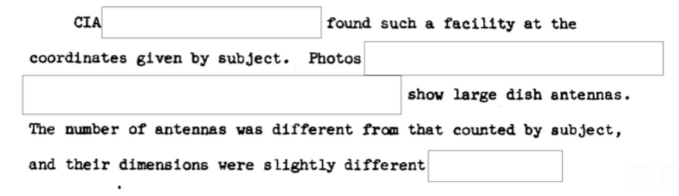 Someone at CIA apparently “found such a facility at the coordinates given by the subject.” The photographs apparently showed antennae dishes as predicted, albeit a different number of them and in different dimensions.
