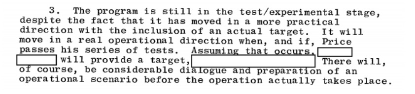 The memo concludes by noting that this is still in the experimental stage, despite moving “in a more practical direction with the inclusion of a real target.” If Price passed the tests CIA was setting for him, though, things would “move in a real operational direction.”
