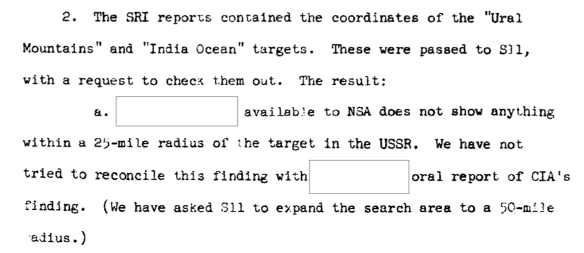 In a section dated August 8th, the NSA memo notes that “Subject” called and volunteer to locate an underground facility. He apparently “found it [and] gave its exact coordinates.” However, he hadn’t “mentioned [REDACTED] specifically, but said to be in the Ural Mountains,” which fits the proposal from CIA. He apparently provided a somewhat detailed external description of the facility.