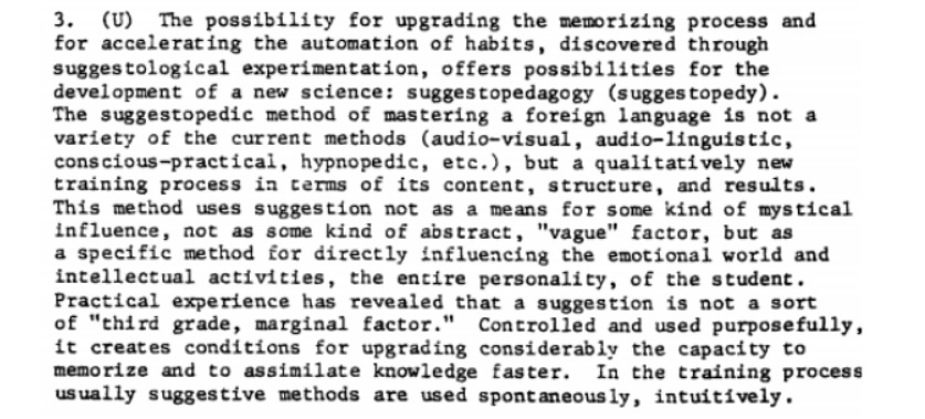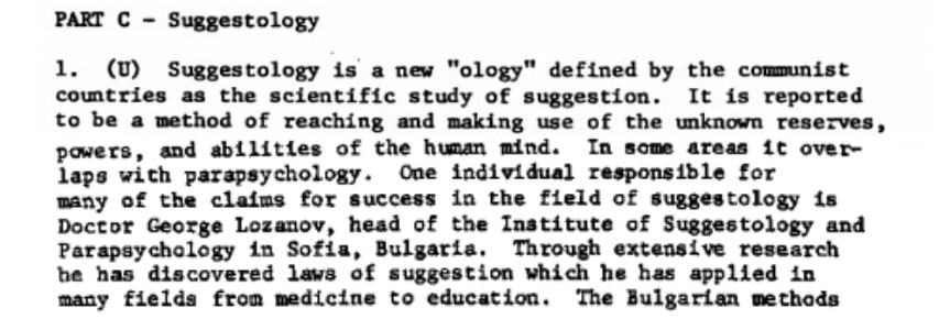 Described in the report as “a new ‘ology’ defined by the communist countries as the scientific study of suggestion,” suggestology was supposed to allow humans to tap into “the unknown reserves, powers and abilities of the human mind.” According to the report, “in some areas it overlaps with parapsychology” which is a bit of an understatement.