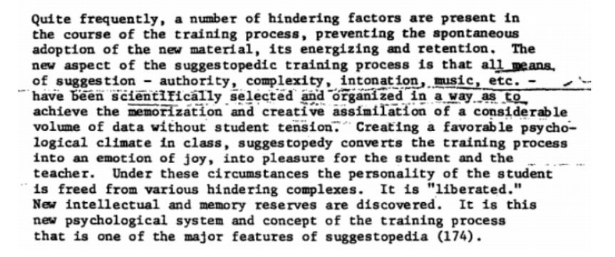 Okay, but how does it work? After insisting that it’s “not a variety of the current methods,” the report appears to explain that it’s a combination of all of them. Suggestology suggests using “all means of suggestion – authority, complexity, intonation, music, etc.” to create “a favorable psychological climate in class.”