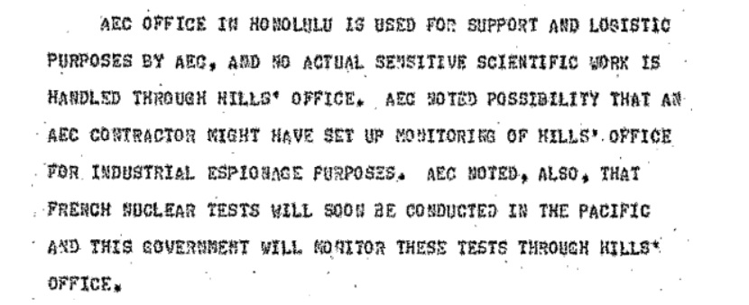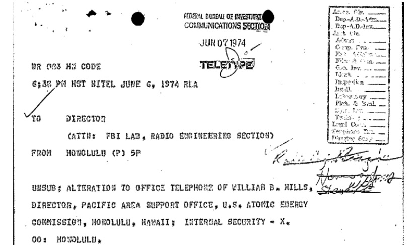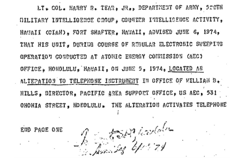 According to the file, the bug was discovered by one Lt. Colonel Harry Tear Jr., assigned to Army counterintelligence at Fort Shafter. While performing a regular electronics sweep in June of 1974, Tear discovered a modification to the phone of Williams Hills, who was the Director for the Atomic Energy Commission’s Pacific Area Support Office, reporting to the Nevada Operations Office.