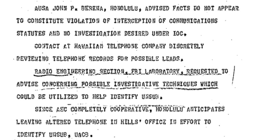 Surprisingly, the FBI was informed by Assistant United States Attorney that there didn’t appear to be a “violation of interception of communications statutes” and that “no investigation [was] desired under [Interception Of Communication].” Nevertheless, the FBI’s contact at the Hawaiian Telephone Company was “discretely [sic] reviewing telephone records for possible leads.” The Bureau decided to leave the device in place for the time being in order to monitor it and discover who was exploiting it. Hills, who was an engineer, was to discreetly check it regularly.