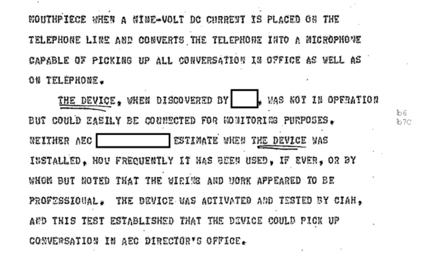 While most of the FBI’s released files on early counter-surveillance measures, or “Technical Security Surveys” as the Bureau called them, show no more cause for alarm than faulty wiring, with a few notable exceptions, one stands out as both an historical curiosity and a demonstration of why clever counterintelligence and law enforcement officers often leave listening devices in place. According to the FBI file, a few months before it was abolished, a bug was discovered in the Honolulu offices of the Atomic Energy Commission. The device would not only let someone listen in on phone calls, but any conversations held around the phone – even when it wasn’t in use.