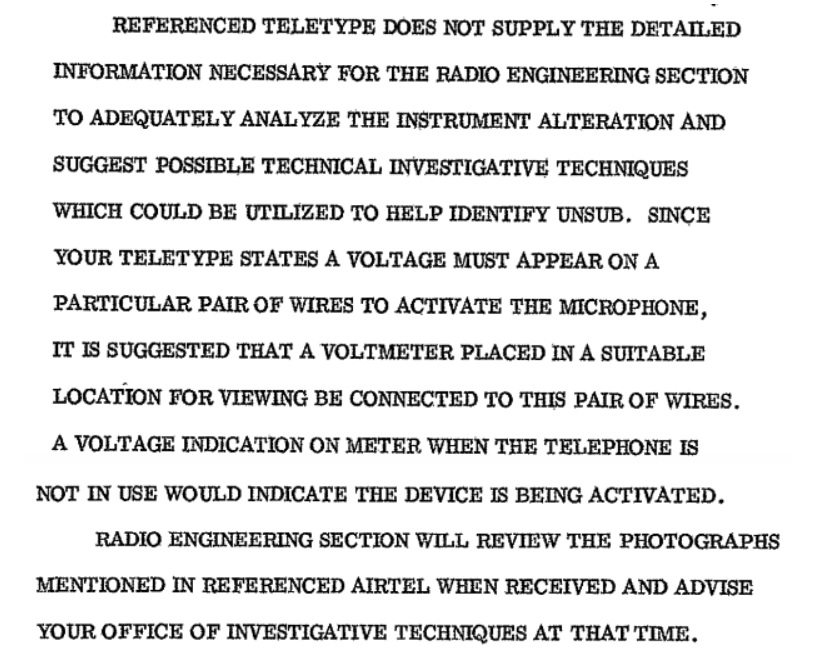 The FBI is a law enforcement entity first and foremost, despite the Bureau’s counterintelligence activities. While it didn’t neglect the latter, the former would always take precedence. FBI Director Clarence M. Kelley responded in a teletype, stating that the Bureau’s Radio Engineering Section didn’t have enough information to analyze the instrument or suggest any specific investigative techniques, though this might change when they received the pictures of the device. In the meantime, Kelley had an idea: use a voltmeter to look for “a voltage indication when the telephone is not in use” which “would indicate the device is being activated.”