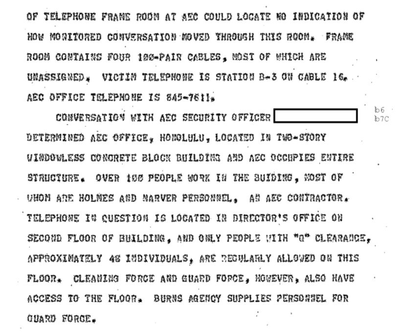 The investigators were apparently unable to determine exactly how the information moved through the telephone frame room. How it was planted was just as much of a mystery. Over 100 people worked in the building, most of them working for the AEC contractor Holmes and Narver. The modified phone was on the second floor of the building, which just under 50 people, all with Q Clearance, could access it. The FBI notes that this number didn’t include the, presumably without clearances, cleaning crew, and the security team provided by the Burns Agency who had access to the floor.