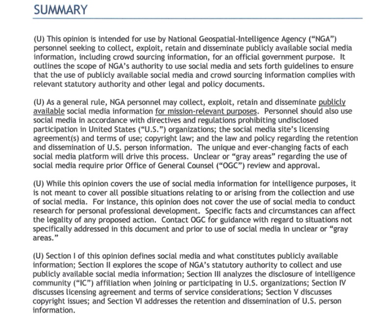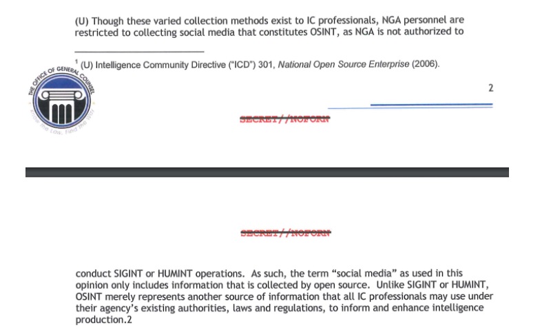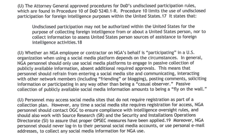One section, which remains partially classified, discusses secret collection techniques, including “entering [redacted] groups” and “interacting with group members and [redacted] from those members” in what the guidelines identify as a form of HUMINT, or Human Intelligence. While NGA is largely prohibited from recruiting human sources online, that restriction doesn’t apply to the Intelligence Community as a whole.