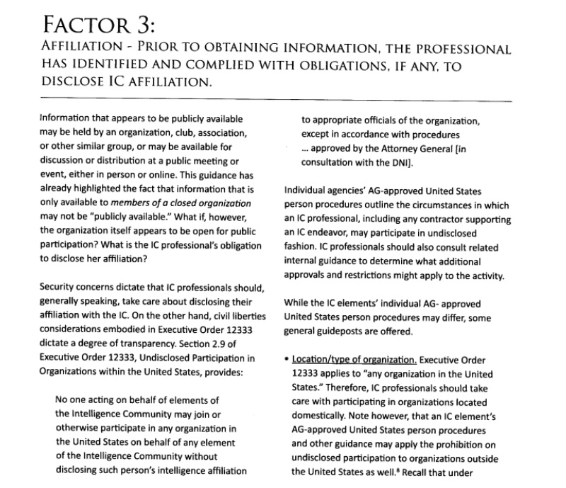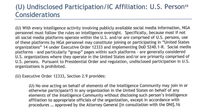 What does apply to the IC as a whole is participating in U.S. based organizations – or more accurately, the undisclosed participation in U.S. based organizations. As the NGA guidelines note, social media platforms and groups within them may be considered U.S. organizations if they’re primarily based in the U.S. or are a large number of their members are U.S. persons.